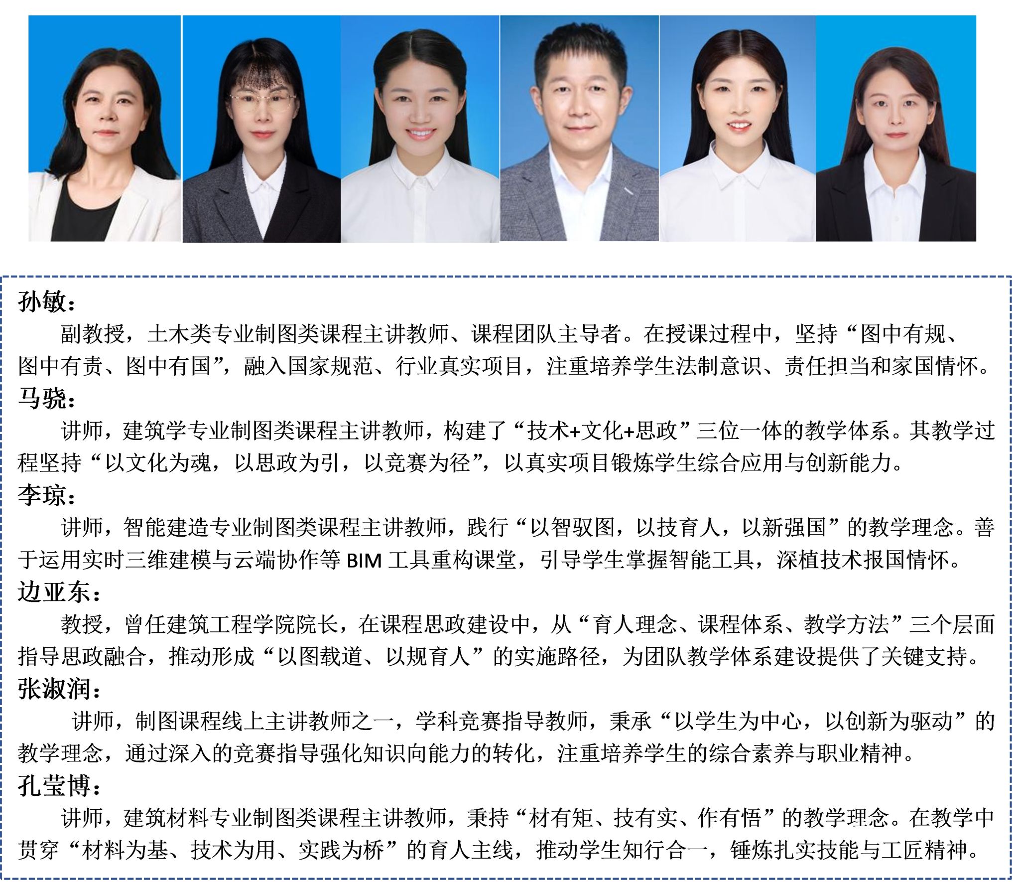 团队依托智能建造与建筑工程学院,融合土木工程、建筑学、智能建造、建筑材料等多学科师资力量,形成了一支结构合理、理念先进、执行力强的课程思政建设主力军。团队注重以工程图学为媒介,传递严谨求实的科学精神、精益求精的工匠文化、服务国家的责任担当,培养学生成为既掌握扎实专业技能,又具备高尚职业道德与家国情怀的卓越工程人才。